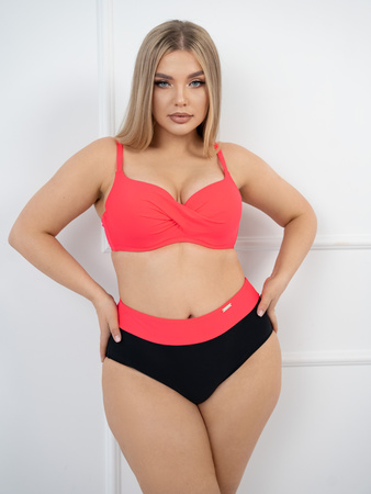 Zweiteiliger Badeanzug in einer Kombination aus Rot und Schwarz. Der im Rücken zu befestigende BH mit leicht gepolsterten Körbchen und Bügeln formt große Brüste perfekt und stützt sie optimal. Dieses Modell eignet sich nur für große Brüste. Der ideale Tragekomfort wird durch die richtige Passform an der Büste gewährleistet.