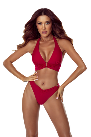 Das Unterteil ist V-förmig geschnitten, was die Taille betont und die Beine streckt.